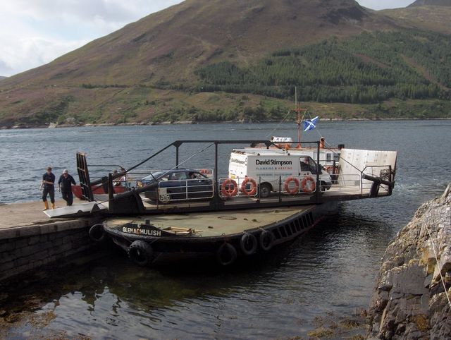 Scotland 2008 -- The very special ferry to Skye. This is an interesting boat with a top that can turn around to let vehicles, bikes and pedestrians get on and off. There was a man to the left of the ferry fiddling with the motor of his boat. He called out to Ruaraidh for help and he went over. It seemed that everybody knew him and called out a greeting.